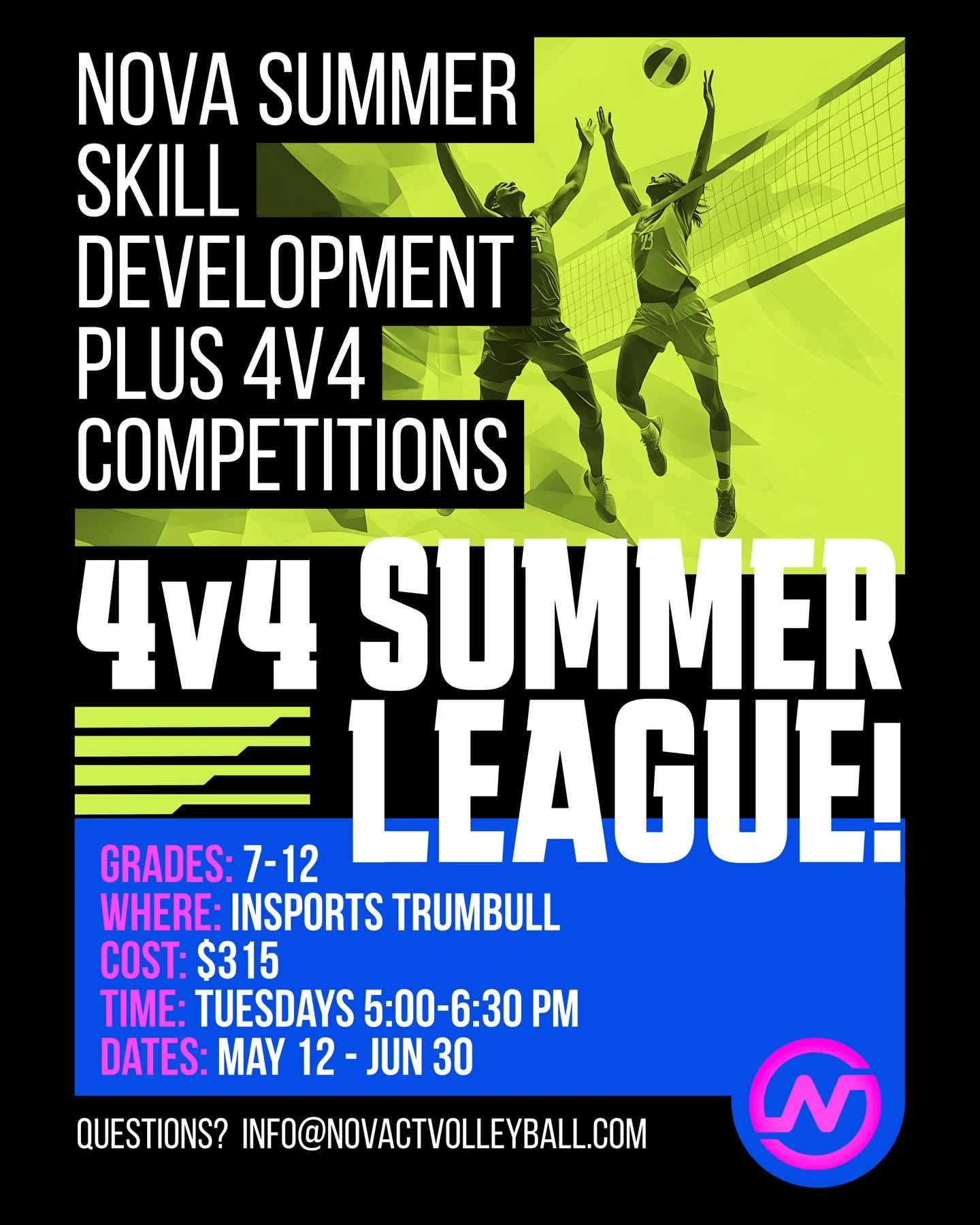 Nova’s 4v4 Summer League is a high energy training environment where athletes can continue to develop individual skills after the club season. Each practice focuses on skill development plus 4v4 or 5v5 scrimmage play with a leader board and prizes at the end! Price includes limited summer t-shirt!